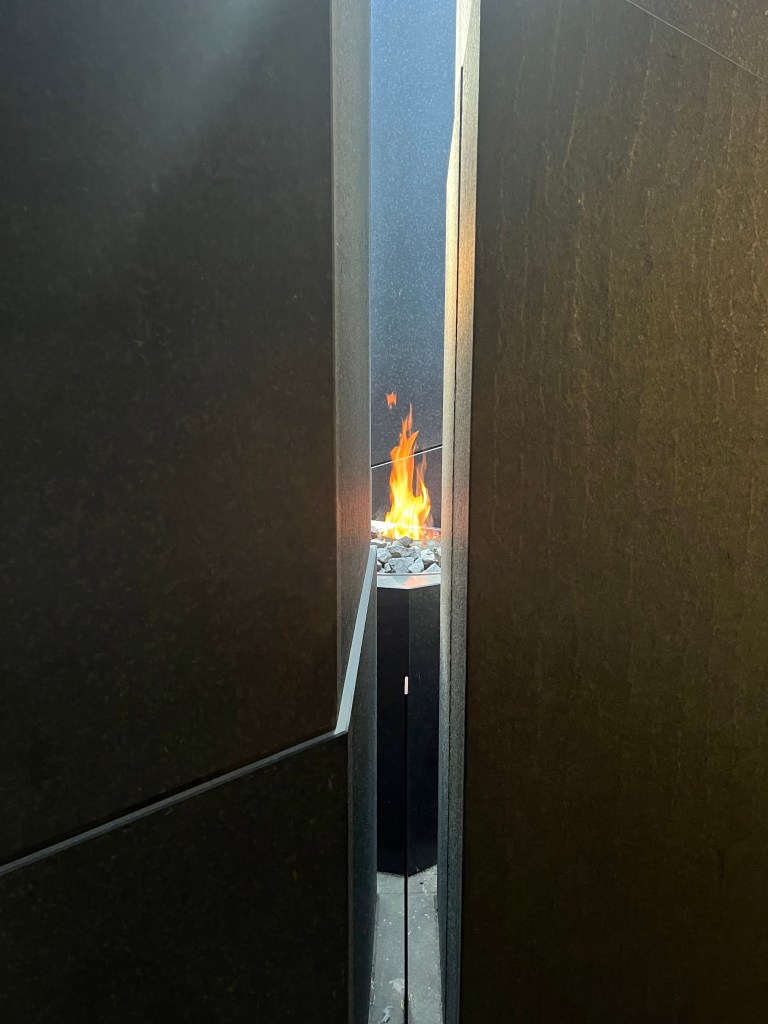 It descends into a covered area where an eternal flame is enclosed in symbolically broken granite.
