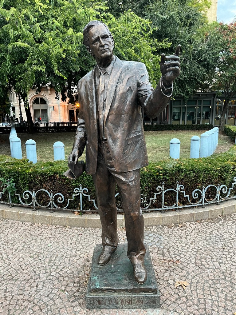 Erected in 2020, the Bush statue depicts the president holding a shred of paper which points back to his 1989 speech in Budapest where he ripped up his rain-soaked text in the middle of his delivery.