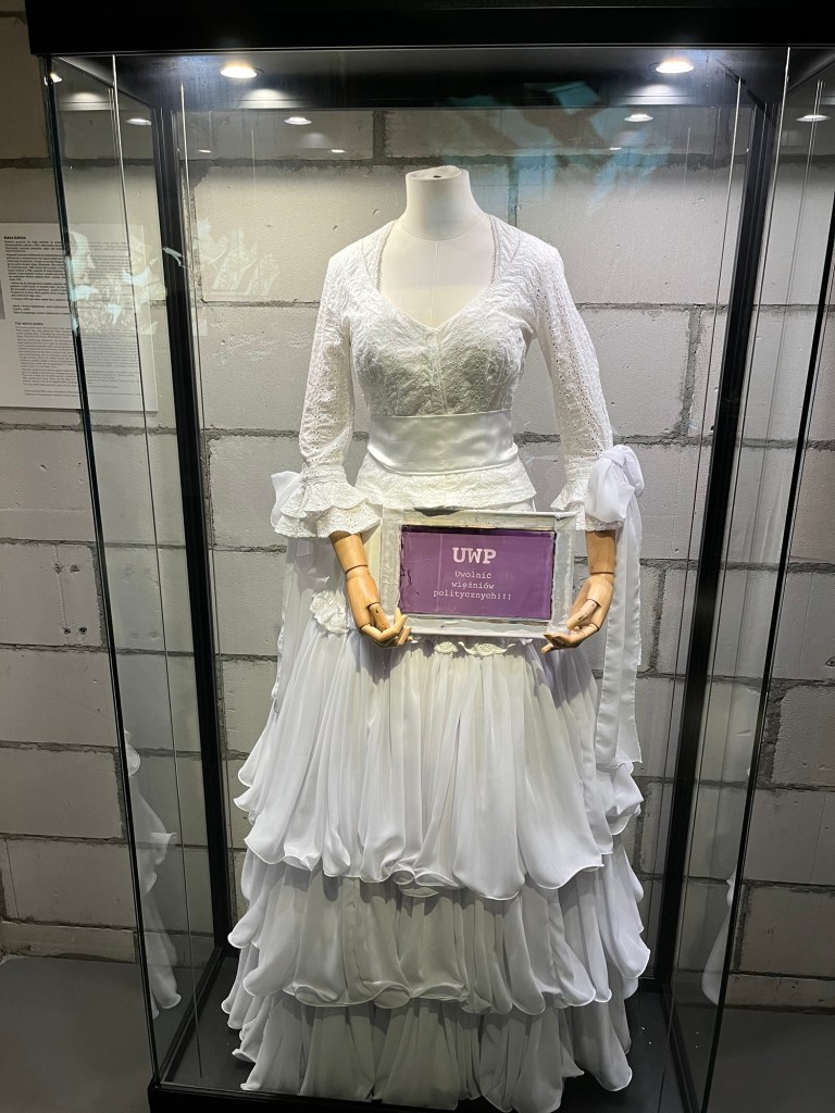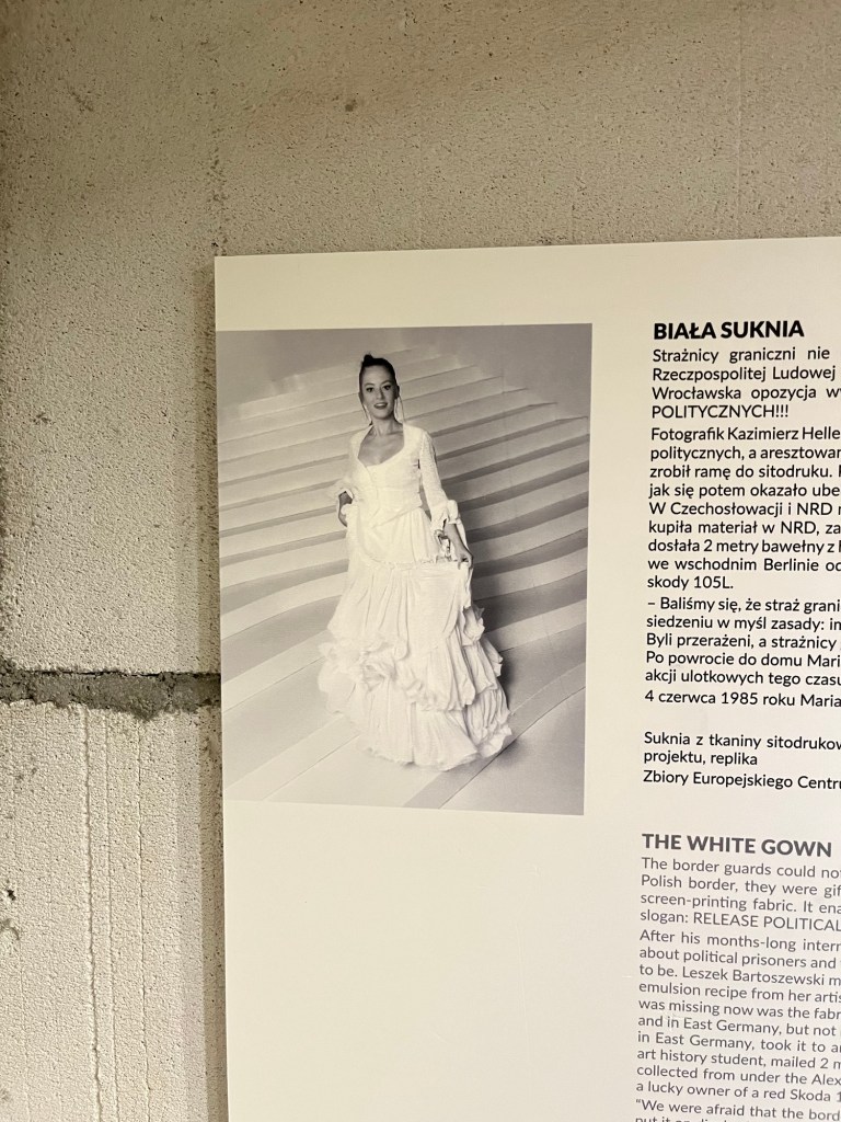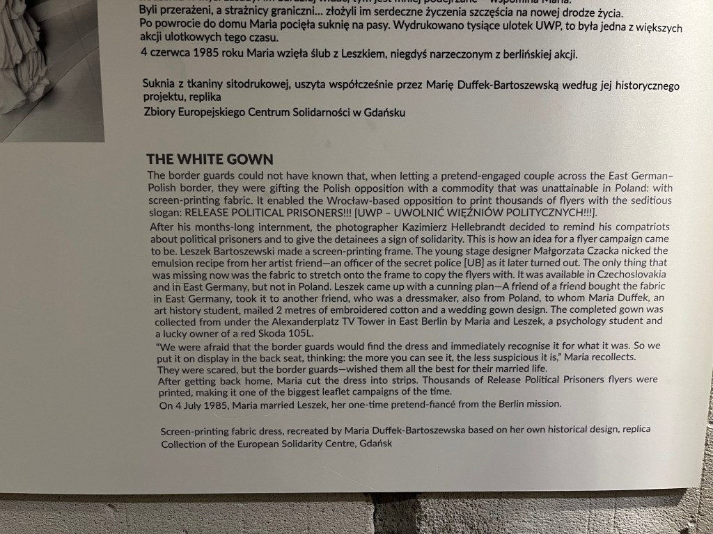 Leaders like Pienkowska and Walentynowicz are prominent, and their stories answer critical questions about the story of Solidarność making their participation easier to capture. Other stories are often more difficult to tell though no less important. For instance, in the middle of an exhibit about underground printing under martial law, stands an incongruous, white wedding dress. [image] The descriptive text explains this is a reproduction which make sense after reading the daring story of this dress. In need of printing materials, a group of students concocted an elaborate scheme to import clothe. Maria Duffek shipped some embroidered cloth and a pattern to a sympathetic dressmaker in East Germany. Then Duffek and Leszek Bartoszewski drove to East Berlin to retrieve the dress. Anticipating difficulty returning to Poland, the pair pretended to be engaged and proudly displayed the gown prior to crossing the border. The ruse worked and the border guards wished them a happy life together. The dress was dissembled, and the cloth used to tell the plight of the imprisoned political prisoners. Ironically, Duffek and Bartoszewski did eventually begin a romantic relationship and married. The exhibit includes a photo of Duffek in the dress alongside the replica she recreated. Duffek was not a labor leader but an art history student who eventually made a career in the Polish film industry.