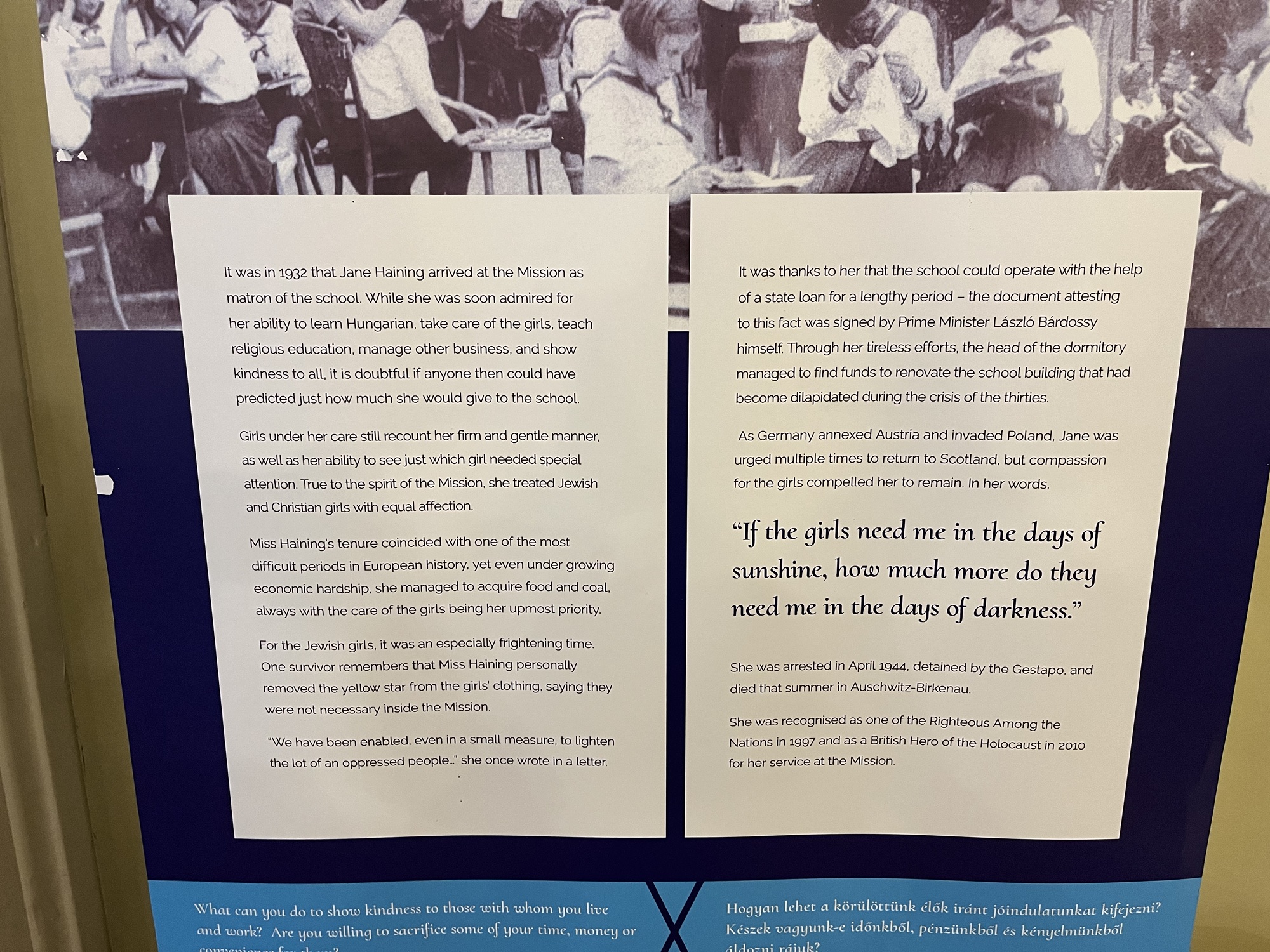 From 1932-1944, Haining was a Scottish teacher and missionary working at a school for girls in Budapest operated by the Jewish mission committee of the Church of Scotland. The primary goal of the school was to educate women in preparation for a Christian life, including the numerous Jewish girls. As such, Haining taught the schools nearly four hundred students as well as tending to the nearly forty student boarders.