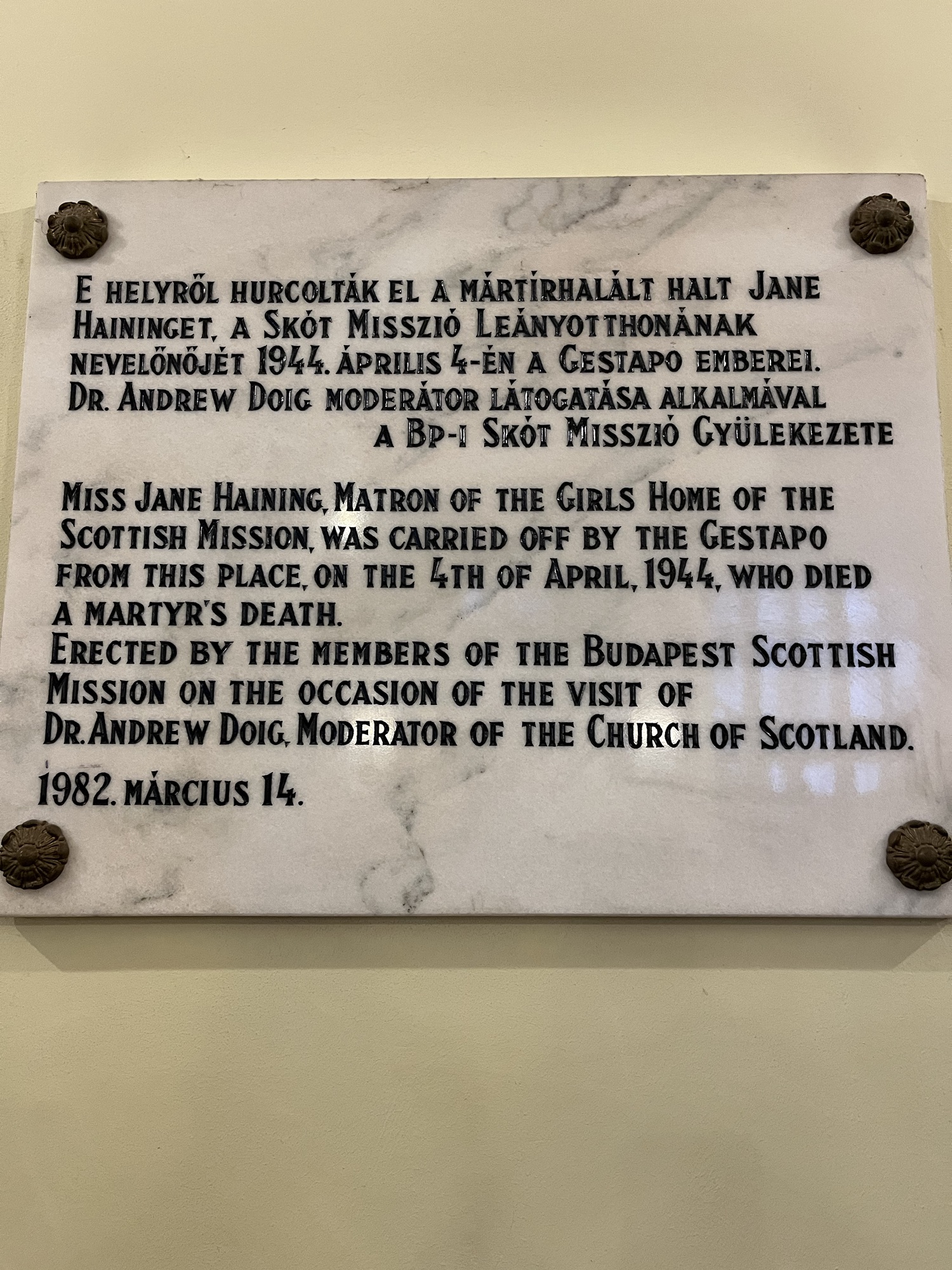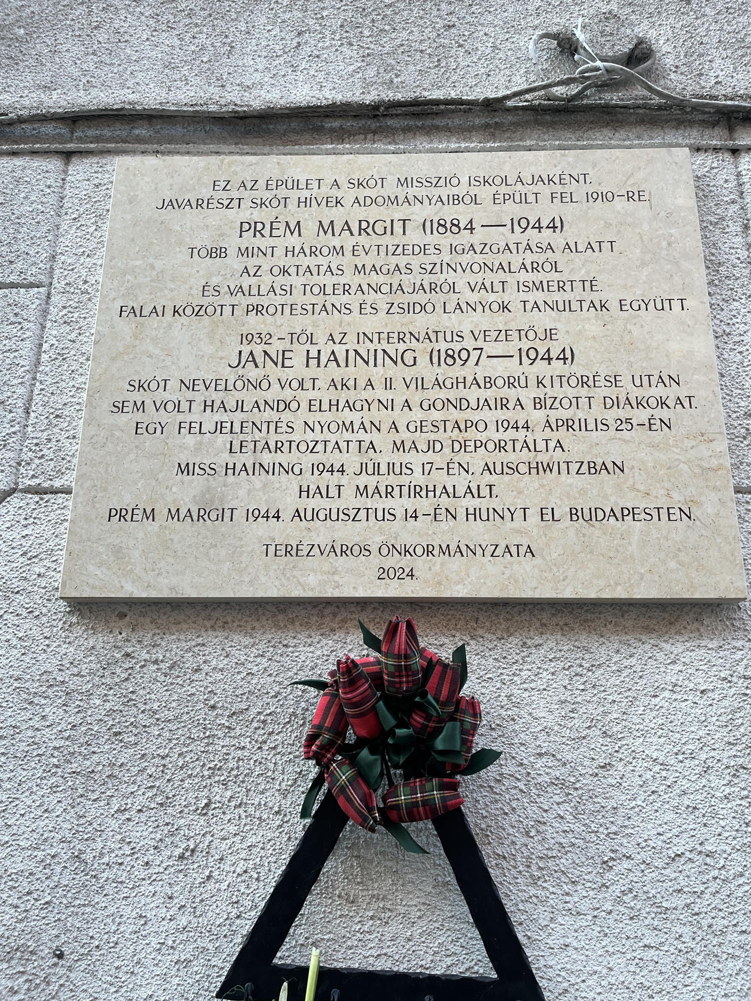 - A good write up about the event, Jane Haining and Margit Prém can be found here: https://churchofscotland.org.uk/news-and-events/news/articles/budapest-honours-scots-holocaust-heroine-who-died-in-auschwitz ↩︎